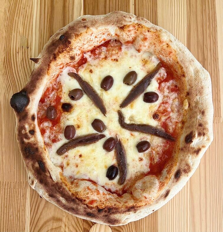 Tomate, mozzarella, anchoa, aceitunas negras.