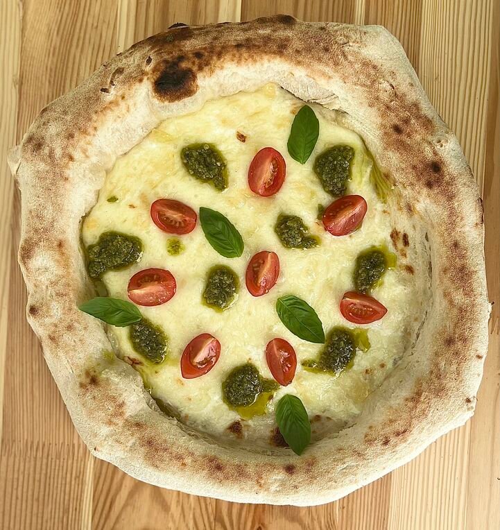 Nata, mozzarella, gorgonzola, tomate cherry, pesto.